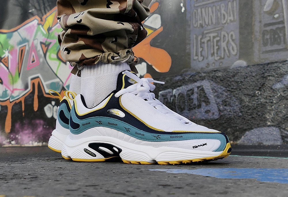 ΠΠ΅Π»ΡΠ΅ Reebok Daytona DMX Π² ΡΠ΅ΡΡΠΎ-ΡΡΠΈΠ»Π΅ Ρ ΡΠΈΡΠΌΠ΅Π½Π½ΠΎΠΉ ΡΠΈΠ½Π΅ΠΉ Π»Π΅Π½ΡΠΎΠΉ Ρ Π²Π΅ΠΊΡΠΎΡΠ½ΡΠΌ Π»ΠΎΠ³ΠΎΡΠΈΠΏΠΎΠΌ ΡΠ²Π΅ΡΡ Ρ. ΠΠ΅ΡΡ Π½ΡΡ ΡΠ°ΡΡΡ Π²ΡΠΏΠΎΠ»Π½Π΅Π½Π° ΠΈΠ· ΡΠΎΡΠ΅ΡΠ°Π½ΠΈΡ ΠΊΠΎΠΆΠΈ, Π½Π΅ΠΉΠ»ΠΎΠ½Π° ΠΈ ΡΠ΅ΠΊΡΡΠΈΠ»Ρ, Π° ΡΠ°ΠΊΠΆΠ΅ ΠΈΠΌΠ΅Π΅Ρ ΡΡΠ°Π΄ΠΈΡΠΈΠΎΠ½Π½ΡΡ ΡΠΈΡΡΠ΅ΠΌΡ ΡΠ½ΡΡΠΎΠ²ΠΊΠΈ, ΠΌΡΠ³ΠΊΠΈΠΉ ΡΠ·ΡΡΠΎΠΊ ΠΈ ΡΠ΄ΠΎΠ±Π½ΡΡ ΡΡΠ΅Π»ΡΠΊΡ. ΠΠ΅Π»Π°Ρ ΡΠ΅Π·ΠΈΠ½ΠΎΠ²Π°Ρ ΠΏΠΎΠ΄ΠΎΡΠ²Π° ΠΎΡΠ»ΠΈΡΠ°Π΅ΡΡΡ Ρ ΠΎΡΠΎΡΠ΅ΠΉ Π°ΠΌΠΎΡΡΠΈΠ·Π°ΡΠΈΠ΅ΠΉ, ΠΎΠ±Π΅ΡΠΏΠ΅ΡΠΈΠ²Π°ΡΡΠ΅ΠΉΡΡ Π±Π»Π°Π³ΠΎΠ΄Π°ΡΡ ΡΠ΅Ρ Π½ΠΎΠ»ΠΎΠ³ΠΈΠΈ DMX, ΠΈ ΡΠ΅ΠΏΠΊΠΎΠΉ ΠΏΠΎΠ΄ΠΌΡΡΠΊΠΎΠΉ ΠΆΠ΅Π»ΡΠΎΠ³ΠΎ ΡΠ²Π΅ΡΠ°.