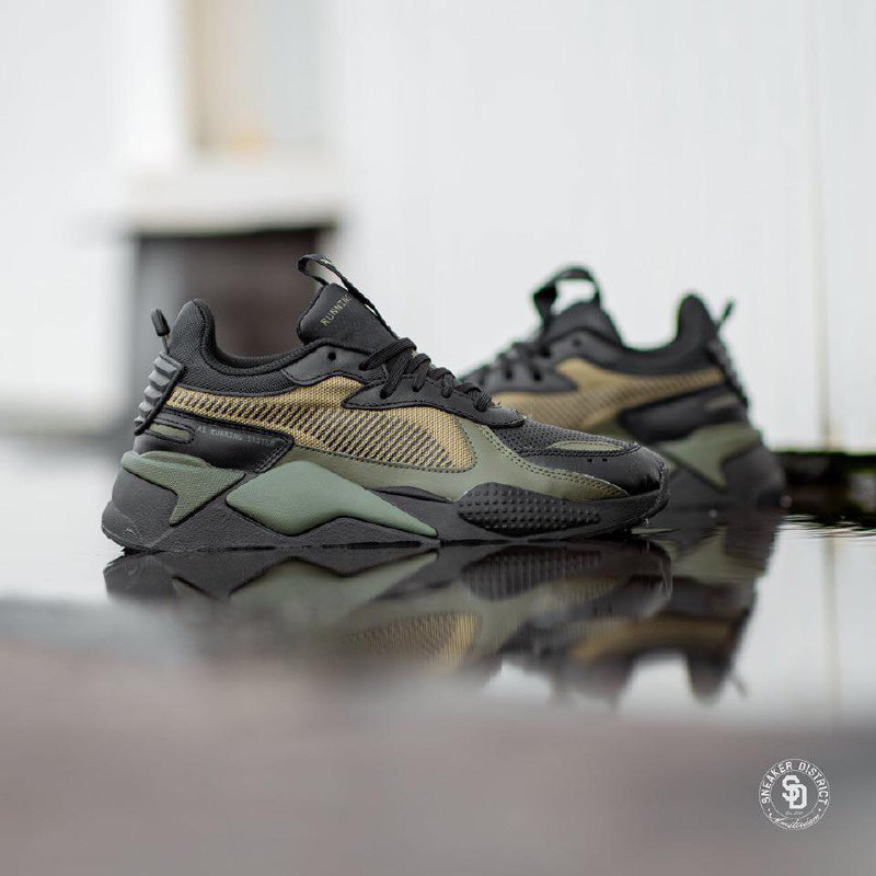 Кроссовки Puma, адаптированные для использования в холодное время года, в сочетании черного и оливкового цвета. Верх RS-X выполнен из водоотталкивающих кожи, замши и прочного нейлнового материала с утепленным материалом внутри. Грубая массивная подошва с яркими вставками дополнена цепкой резиновой подметкой и знаменитой технологией амортизации "Running System".
