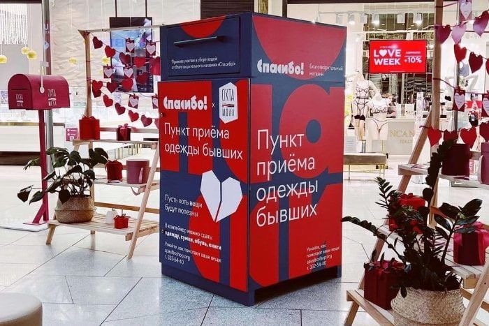 Если вы живёте в Питере и в чулане завалялись вещи бывшего партнёра, то их можно сдать на благотворительность. Эту акцию придумали фонд «Спасибо!» и ТЦ ОХТА МОЛЛ. Куб простоит в торговом центре до 15 февраля.
