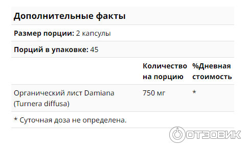 Дамиана Форте выпускается в капсулах . Вес каждой - 500 мг активных веществ . Состав Основной компонент БАДа - листья Дамианы . В одной капсуле содержится 200 мг этого растения . Трава уничтожает бактерии, приводит в норму тестостерон . Если у женщины повышенное содержание этого гормона, то происходит снижение либидо . Дополнительно листья Дамианы: