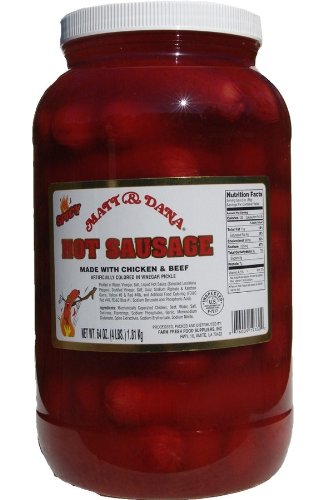 This item: Matt & Dana Hot Sausage - Gallon $41 .99 ($0 .66 / 1 Ounce) In Stock . Sold by Mad Hatter Investments, Inc and ships from Amazon Fulfillment . FREE Shipping . Details . Herbs RED HOT Pickled Sausage (1 Gal . Jar) 39 Count Beef & Chicken No Pork ( From Jersey Candy . . .