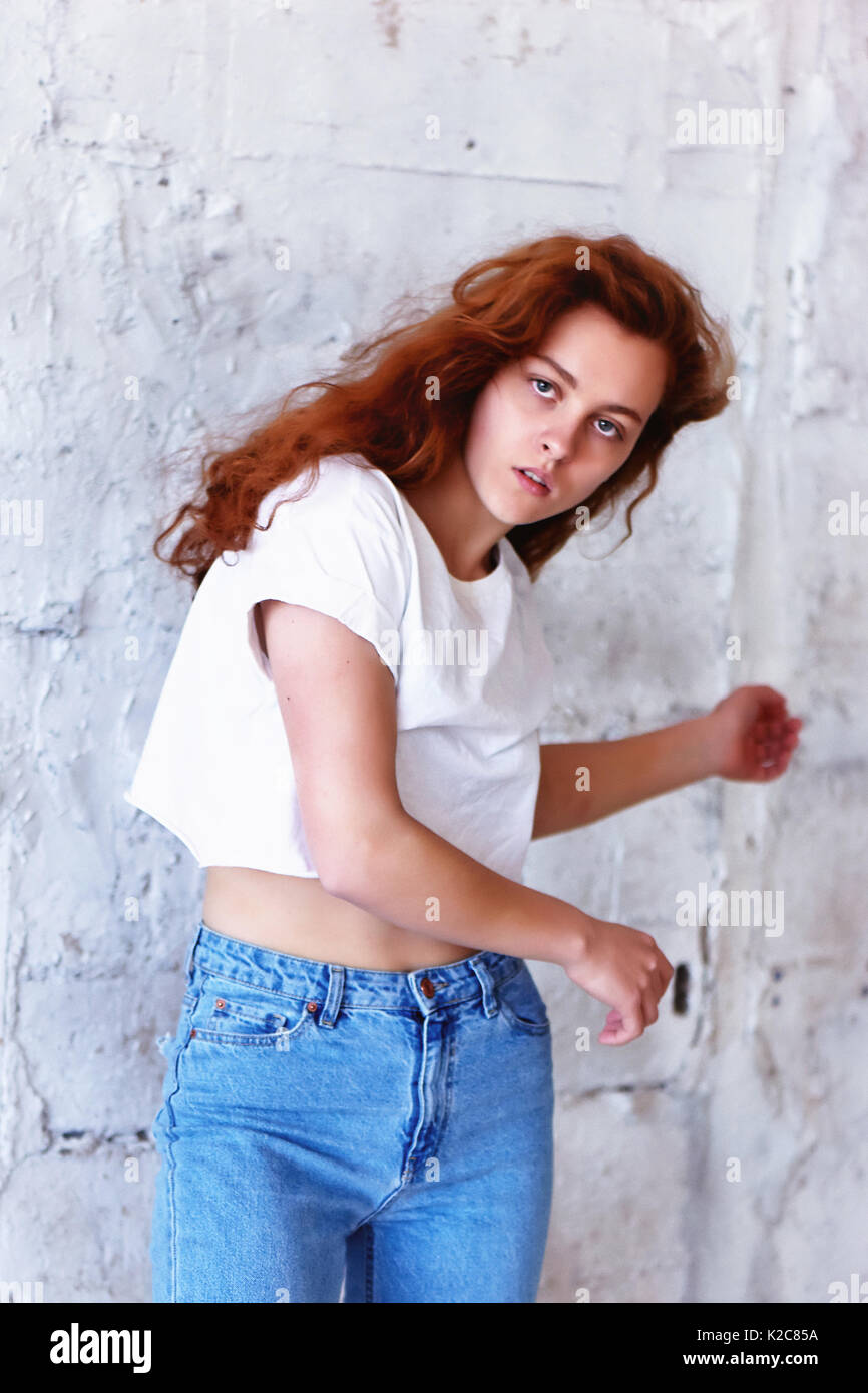 Cheerful Redhead Girl Having Fun Smiling and Dancing in Studio .