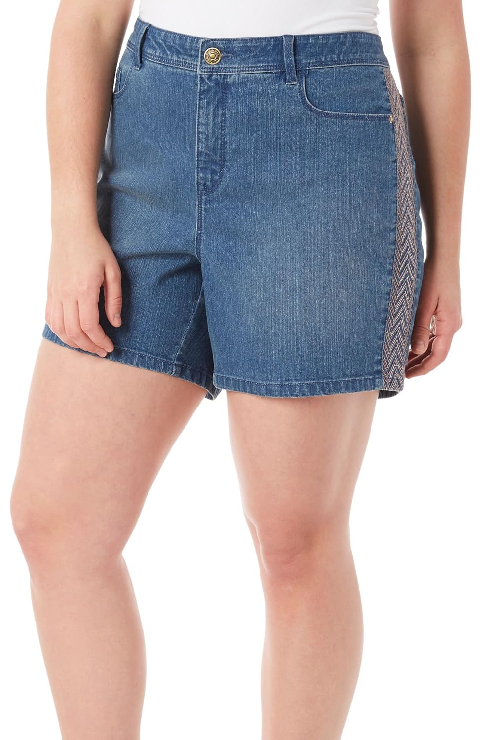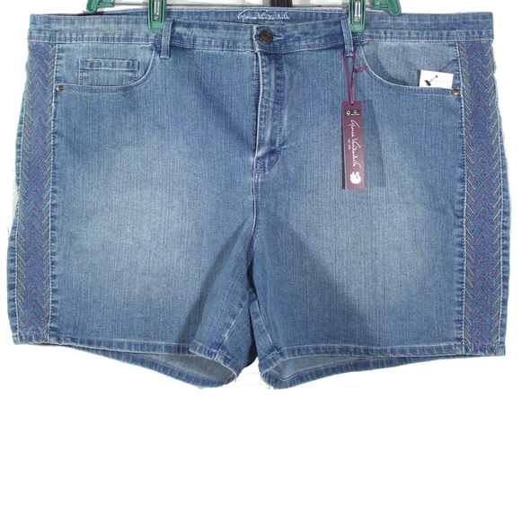 This is a NWT Plus 24W Maya Danica Embroidered Blue Jean Stretch Shorts by Gloria Vanderbilt . The front has a zipper and button . There are front pockets and hip pockets . They have an all around slimming effect .
