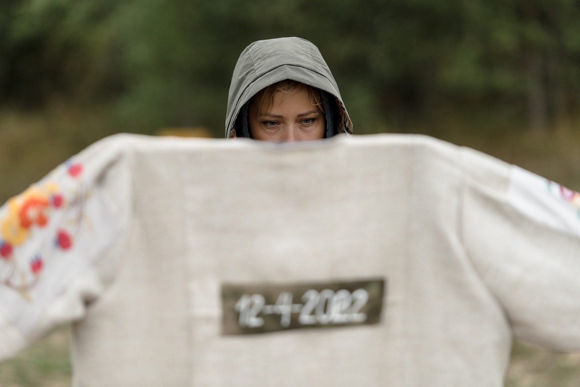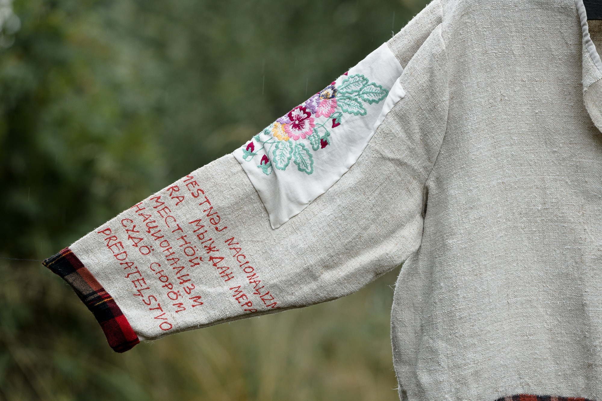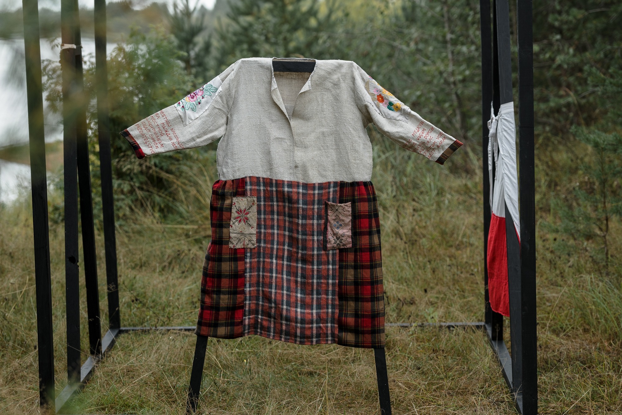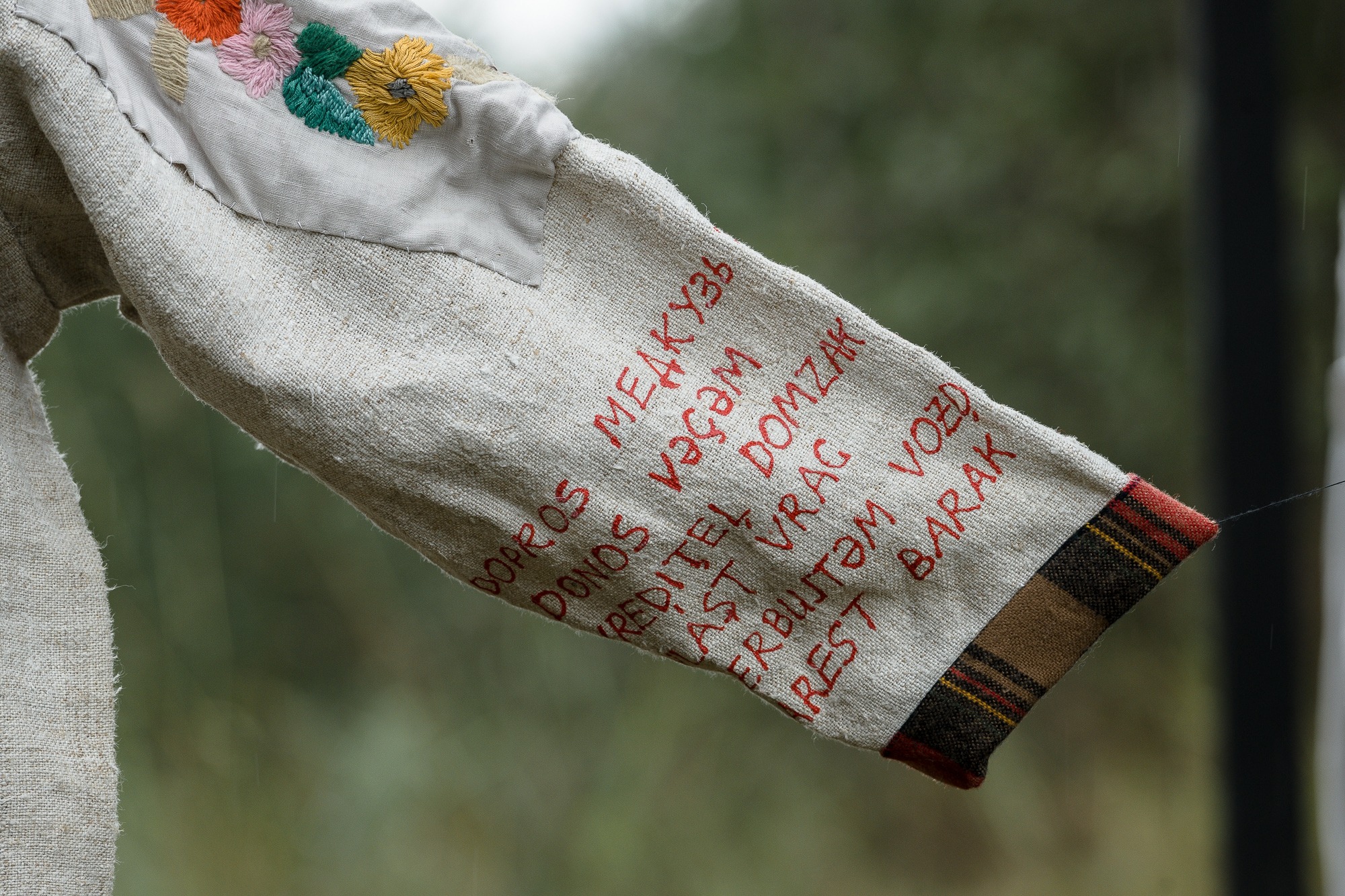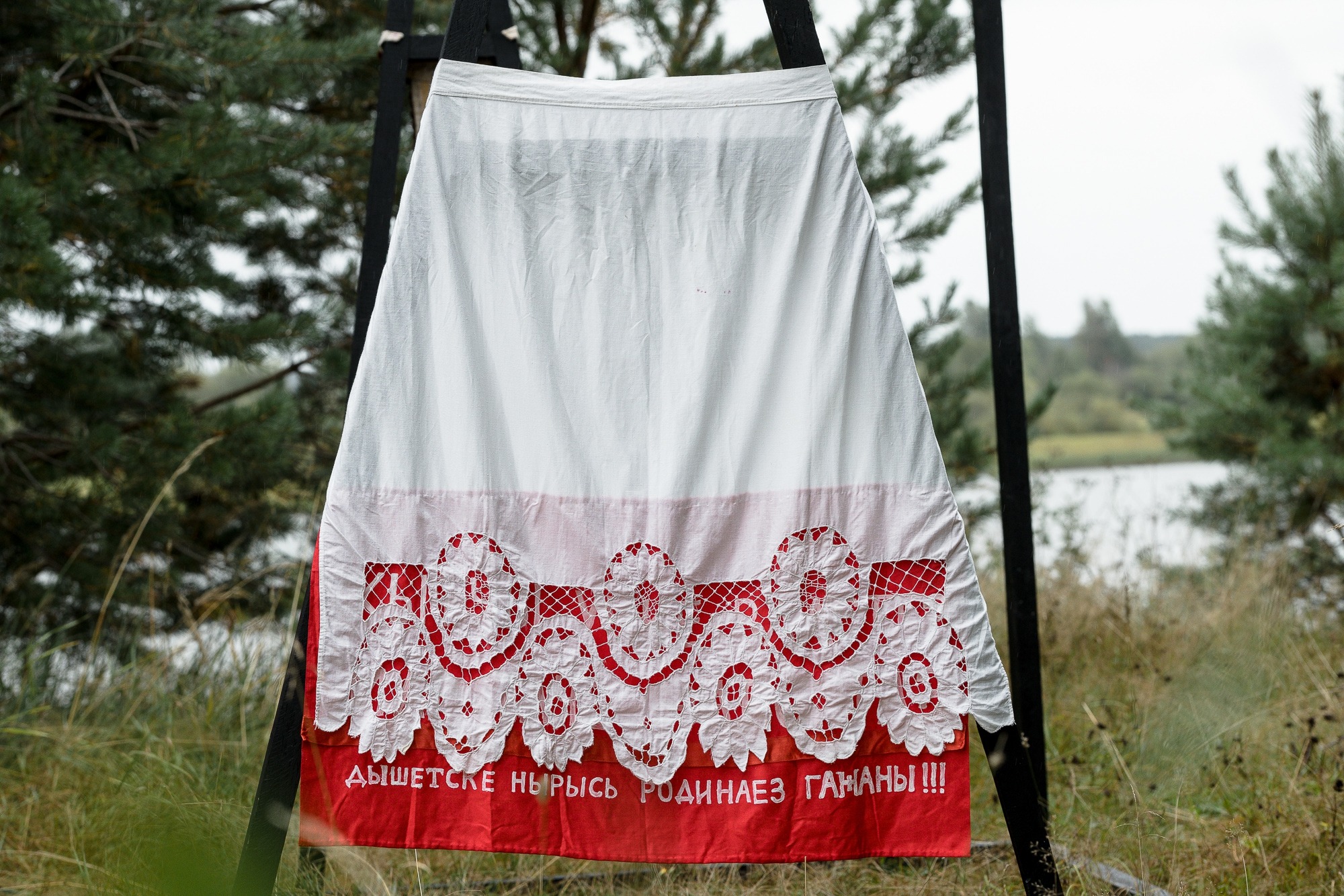 The texts in the third object of the installation (a skirt) are translations of several sentences from a recent denunciation (public accusation) against Darali Leli into Udmurt. By modifying them into the comfortable space of her native language, the artist therapeutically neutralizes their destructive character. The words from the terminological dictionary of 1934, used to translate some of the words, reveal the disturbing relevance of the events of the recent past. The reference to an almost forgotten and inactive vocabulary developed 90 years ago is paralyzing the viewer by the horror of its possible greater relevance in the future.