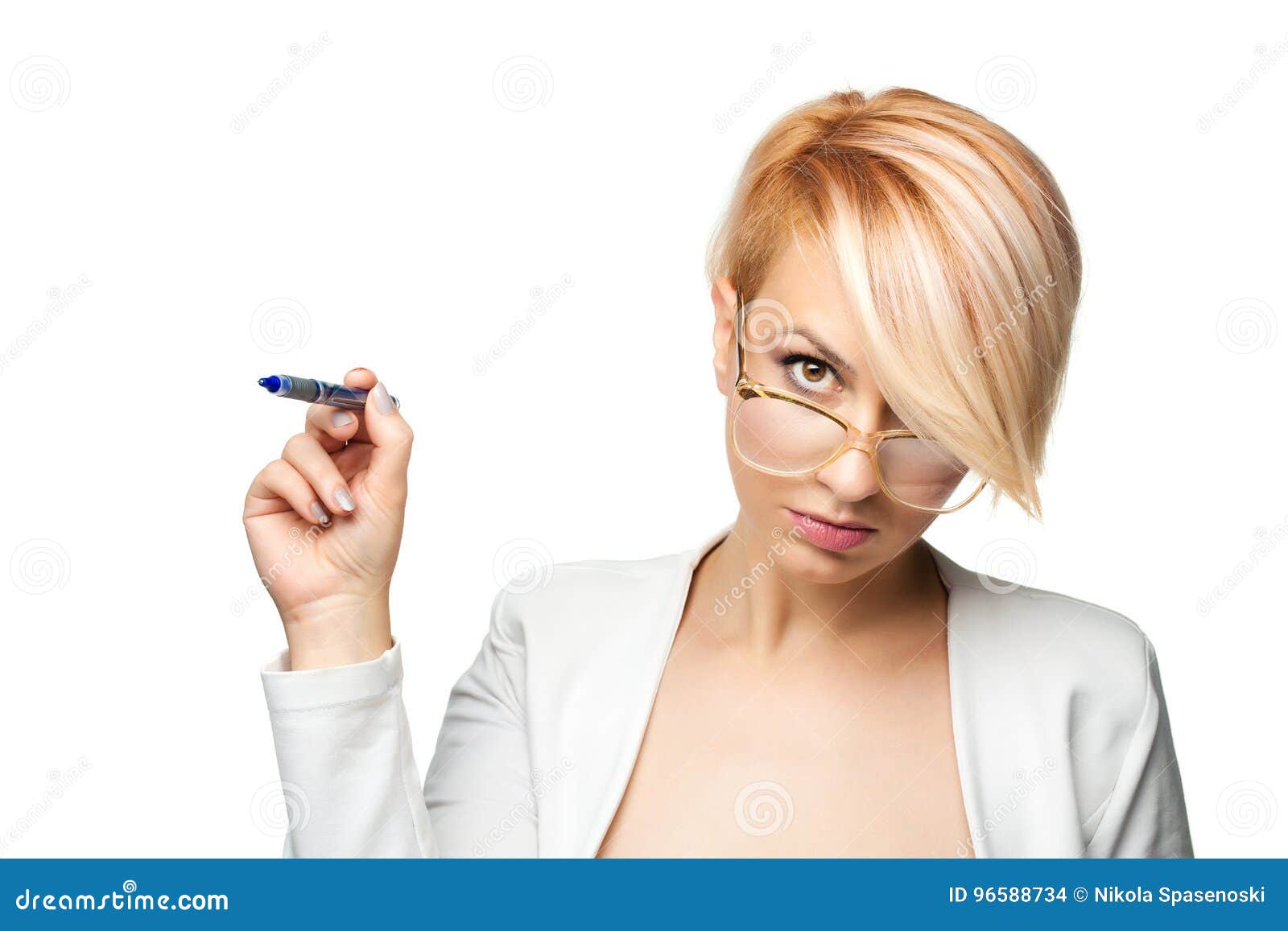 Die blonde Bitch trägt rote Strümpfe