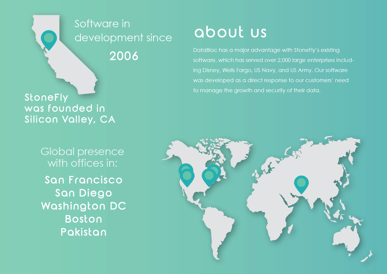DataBloc is the first enterprise-class economic sharing for data storage and services. The DataBloc platform is a web platform that connects company and customer service providers seamlessly and safely. DataBloc software, also known as StoneFusion, will be the 9th generation blockchain solution developed by StoneFly, a well-established data service company based in Silicon Valley. StoneFly has invested around 40 million USD into this product and has more than 16 full-time software engineers working on development. This software supports various data services and types of storage, and offers data optimization, availability, accessibility, security and quality data protection for companies.