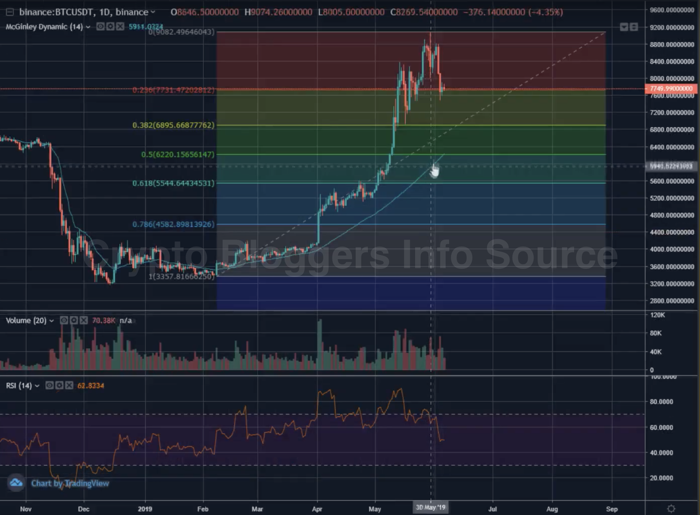 После формирования восходящего клина цена начала падать ниже уровня поддержки. Я буду терпеливо наблюдать за ключевыми уровнями, в первую очередь за уровнями Фибоначчи. Для краткосрочной торговли можно обратить внимание на 0.382, откуда цена может отскочить, начав формирование фигуры "голова и плечи", а это рост с ~$6900 до ~$8400. Если рассматривать более долгосрочную перспективу, то более привлекательными выглядят уровни 0.5 (~$6200 USD) и 0.618 (~$5500-$5600). Одной из причин, почему я рассматриваю настолько низкие уровни, является тот факт, что цена так и не достигла $10000, чего очень многие ждали. Если учитывать, что ожидаемая коррекция должна составить 40%, то от $10000 это было бы как раз $6000, но так как цена достигла только $9100, то и финала коррекции стоит ожидать несколько ниже. В пользу этого сильного уровня поддержки говорит и тот факт, что осенью 2018 на этой цене была проторговка. Если всё окажется так, как я предполагаю, то я буду распаковывать заначку и закупаться, при этом я начну открывать позицию с $6200.