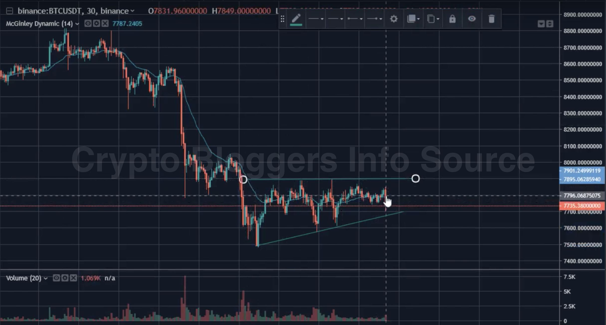 Вчера цена bitcoin падала после краткосрочного роста. В такие моменты больше всего меня волнует возможность пробоя восходящей поддержки. Те, кто настроен по-бычьи, рассматривают формирование восходящего треугольника, и это вполне может оправдаться.