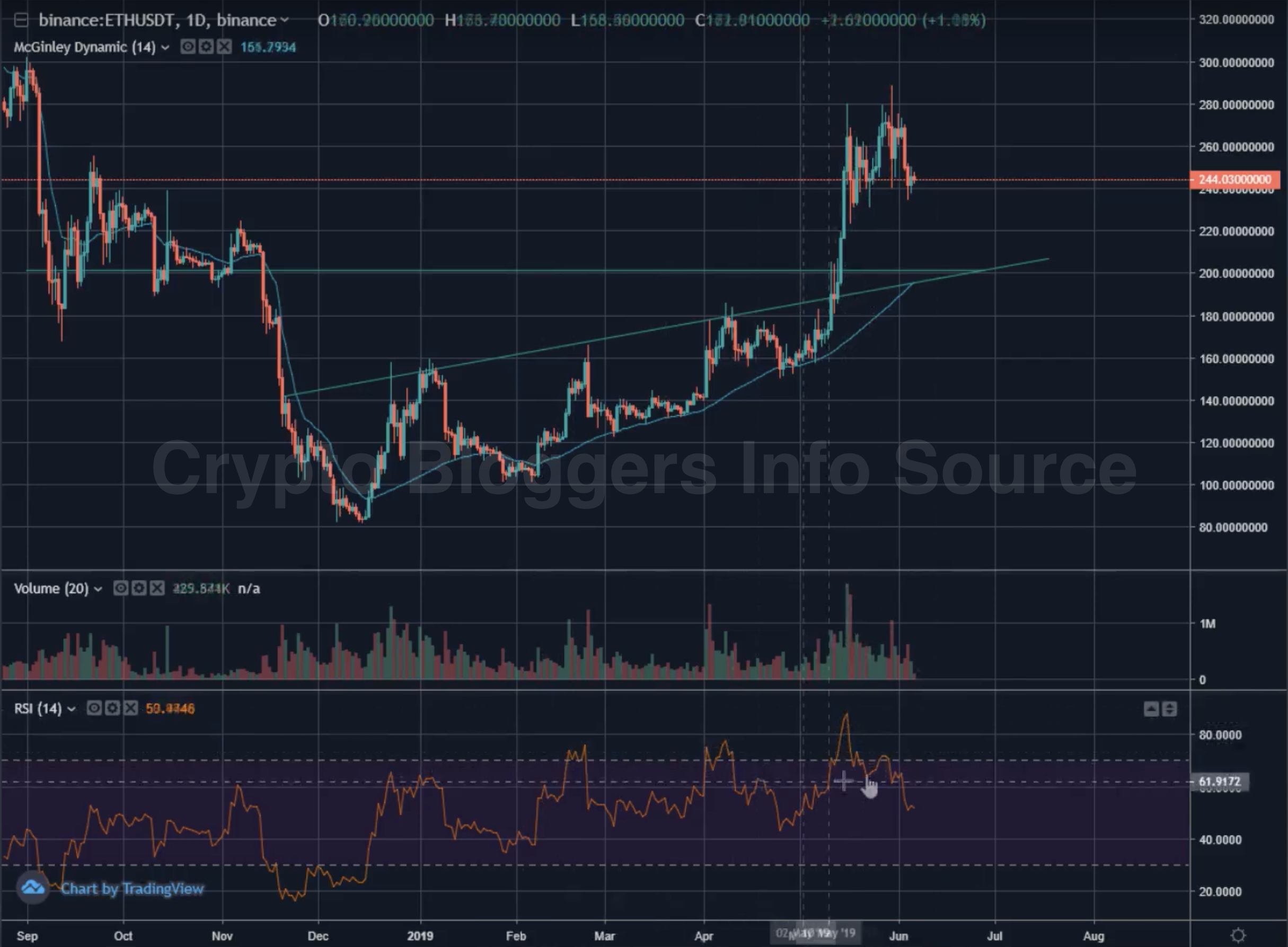 Также хочу отметить, что когда вы видите что RSI после продолжительного нахождения в зоне перекупленности возвращается в норму, то разумно ожидать дальнейшей коррекции, так как обычно RSI падает в зону перепроданности. Похожую картину видно и на графиках ETH и XRP. По ETH хотелось бы увидеть $200, так как это был предыдущий уровень сопротивления, а перед этим сильный уровень поддержки перед тем, как цена ушла на ~$85.