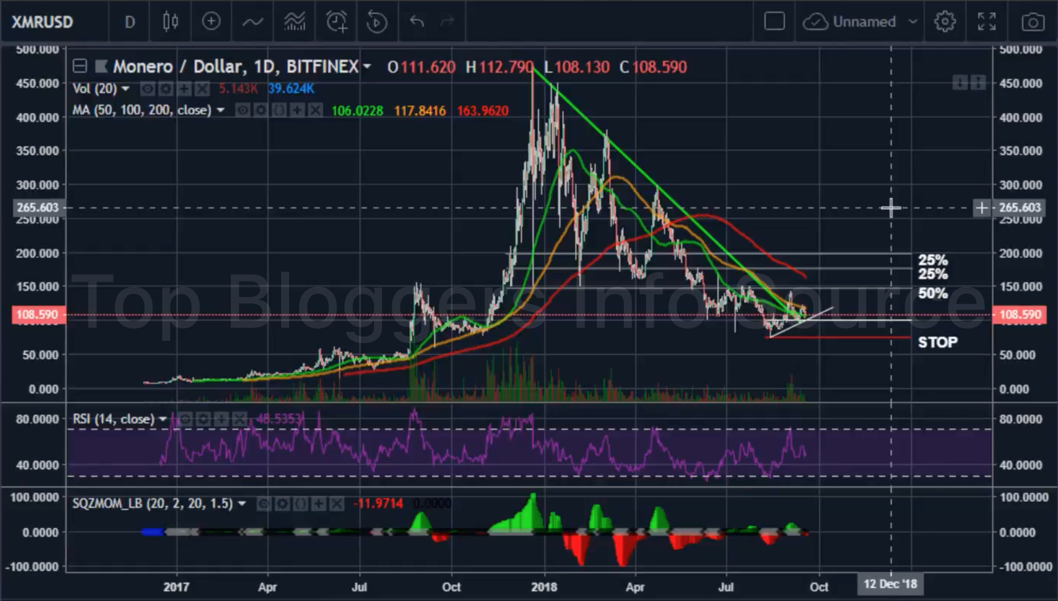 В последнее время большое внимание приковано к XMR, потому как её торговый паттерн легко читаем. Как только цена достигает зелёного уровня поддержки, это сигнал на открытие первой позиции. Мы видим, что Monero хорошо держится на рынке, в то время как остальные альткоины обновляют свои нижние значения. Я думаю, что сейчас цена пойдёт на ретест скользящей средней за 50 дней, что даст возможность открыть позицию на $100, что станет последней точкой перед консолидацией и дальнейшим ростом. Мы уже видели подобное поведение цены, вслед за которым цена стремительно росла за 1 день. Обратите внимание на то, что необходимо иметь некоторый запас на стоп-лоссе, чтобы вследствие повышенной волатильности ваша позиция не оказалась преждевременно закрытой. В паре к USD, RSI находится в зоне перепроданности и цена пробила наклонный уровень сопротивления, будет очень хорошо, если при этом монета будет показывать более высокие нижние значения. Я открывал позицию по $100, но не обязательно дожидаться именно этого значения, стоп-лосс на $75, точки выхода на $150, $180 и $200. Я уверен в Monero, так как это одна из немногих анонимных валют с высокой ликвидностью, что очень важно при сложившейся на рынке ситуации, когда малые объёмы не дают значительного движения цен. Примечательно также и то, что объёмы торгов по этой монете выглядят органическими - многие иституциональные и индивидуальные инвесторы начинают интересоваться одноранговыми цифровыми валютами.