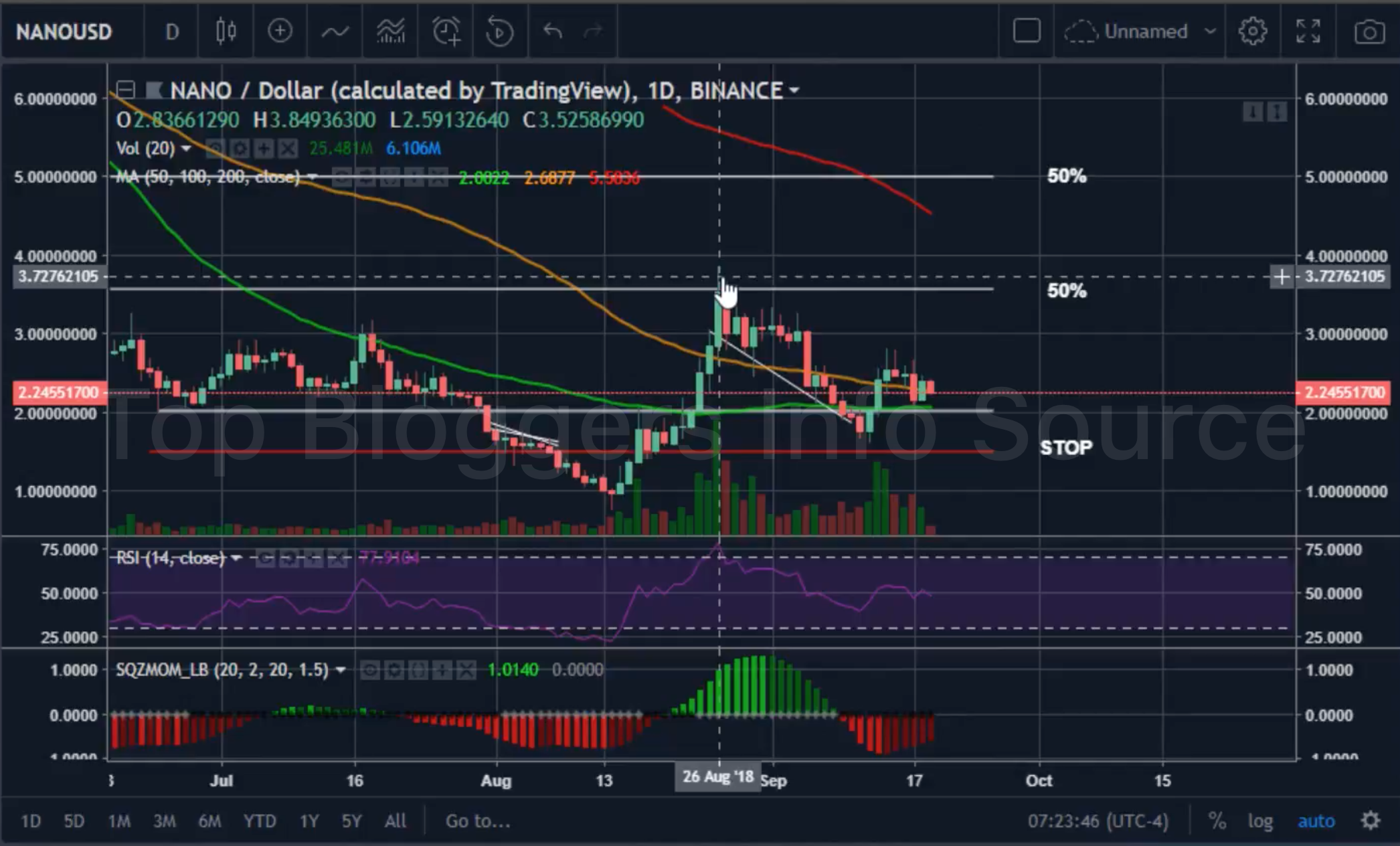 Я уже много говорил об этой монете, и она показала хороший рост в августе, учитывая, что была самой перепроданной с декабря 2017. Сейчас Nano хорошо держится над скользящей средней за 100 дней в паре к Bitcoin. Как и положено, после августовского роста мы наблюдаем коррекцию, но, в отличие от предыдущих, она не развилась в нисходящий тренд, напротив, мы видим формирование нового тренда. Если цене удастся удержаться выше поддержки на 2750 сатоши, то рост должен продолжится. Сейчас я не уверен в росте крипто рынка к новым высоким значениям, для этого нужен некоторый катализатор. Я открываю все свои позиции по отношению к USD, и хочу взять Nano по ~$2, или в районе скользящей средней за 50 дней по отношению к BTC, если этого не получится, то вход будет на $2.82. Стоп-лосс на $1.50, тейк-профиты на $3.60 и $5. Я уверен, что, когда цена дойдёт до уровня скользящей средней за 200 дней, ей может потребоваться некоторое время на ретест и дальнейший рост.