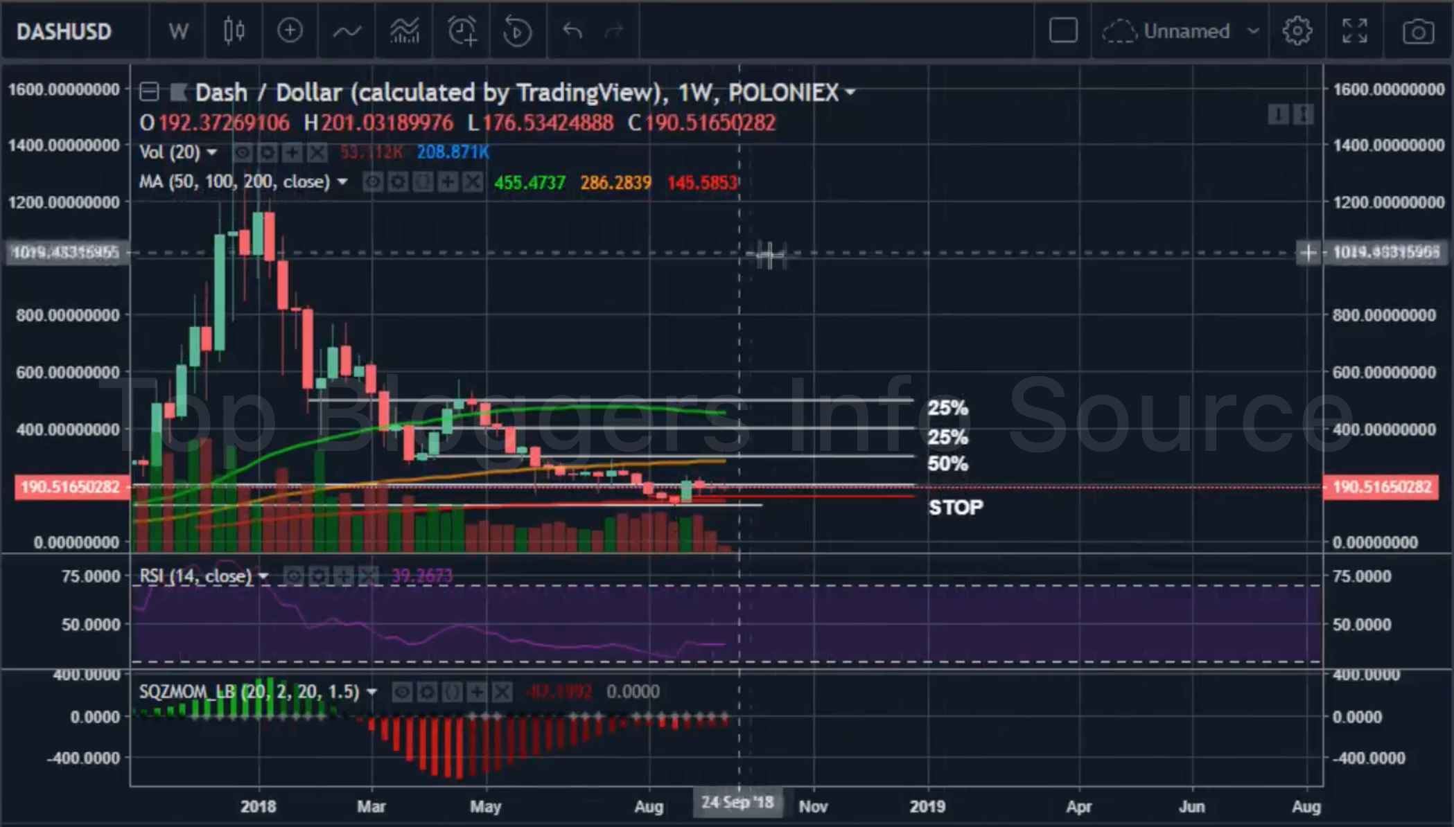 Я много говорю об этой монете, так как в отличие от большинства команд на рынке, не предпринимающих каких-либо серьёзных маркетинговых шагов, Dash очень много работают. Не важно, как вы относитесь к этой монете, я заинтересован в ней с точки зрения трейдинга по нескольким причинам: её начали принимать продавцы в Венесуэле, что создаёт новостной фон вокруг Dash, который формирует хайп; объёмы торговли растут; RSI находится в зоне перепроданности, в которой последний раз находился в 2015; по отношению к BTC монета подешевела в 6 раз, а в паре к USD - в 10 раз; цена отскочила от ключевого уровня поддержки на скользящей средне за 200 недель. Я открывал позицию в диапазоне $190 - $200, стоп-лосс стоит на ~$160, а тейк-профиты на $300, $400 и $500. Если цене удастся пробить уровень сопротивления на скользящей средней за 200 дней, нас ждёт дальнейший рост.