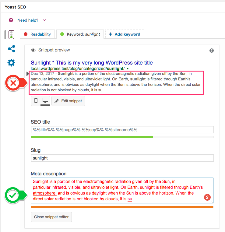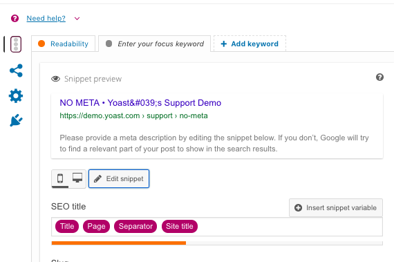 1 .Show date in snippet preview and add text in the meta description template (can include variables or not) . 2 .Add a focus keyword from the template and see the warning appear . 3 .Hide the date snippet preview