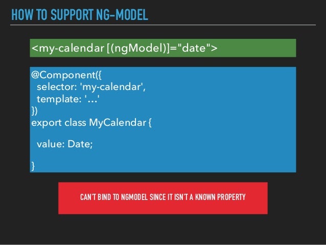// this selector changes the previous behavior silently and might break existing code selector: 'input[type=date][formControlName],input[type=date][formControl],input[type=date][ngModel]' But please be aware, that this might break existing implementations that rely of the old behaviour .