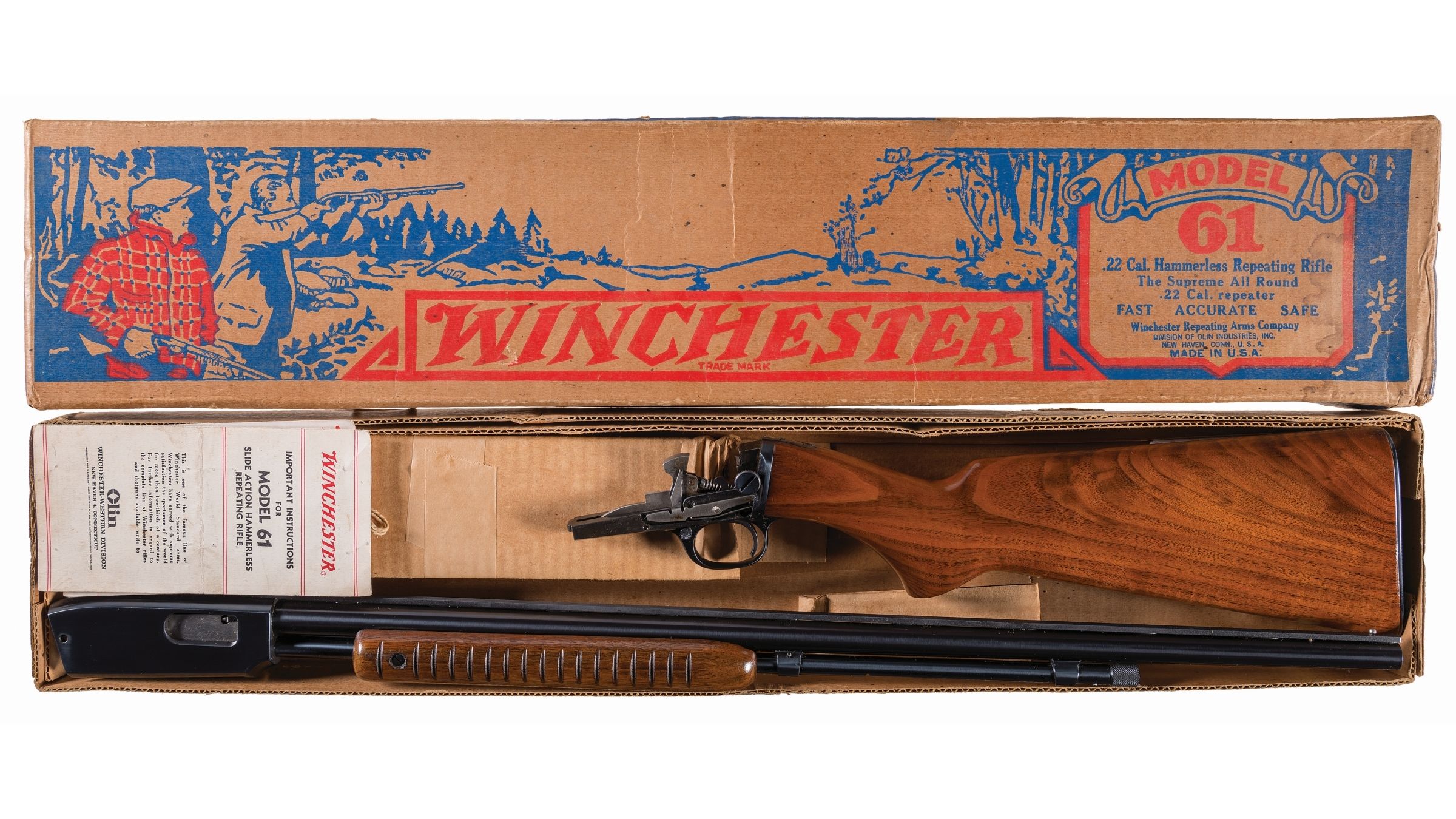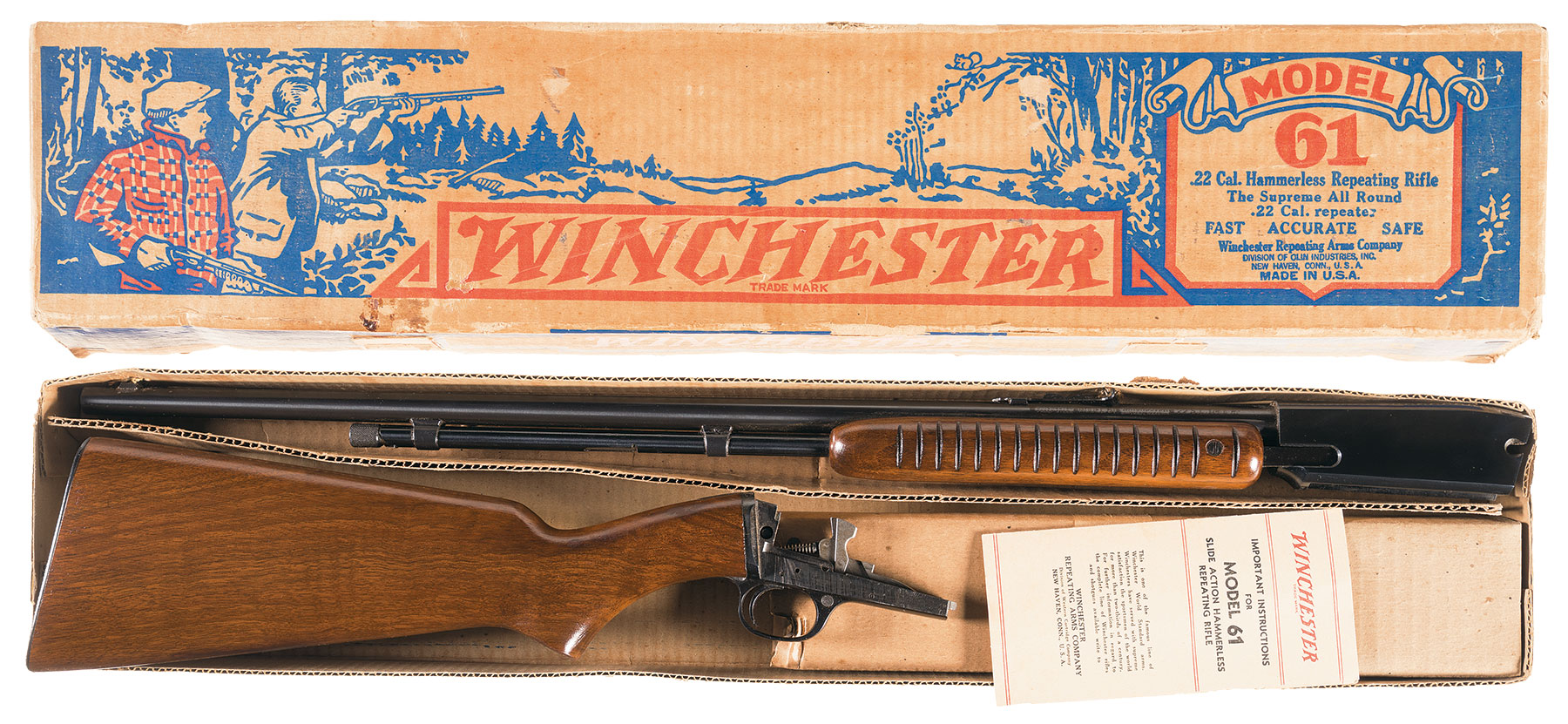 • The Winchester Model 61 was an American slide-action .22 caliber rimfire rifle produced by the Winchester Repeating Arms Company from 1932 to 1963 . Winchester's first hammerless slide-action rifle design, the Model 61 acted as a "replacement" for the Model 62 .