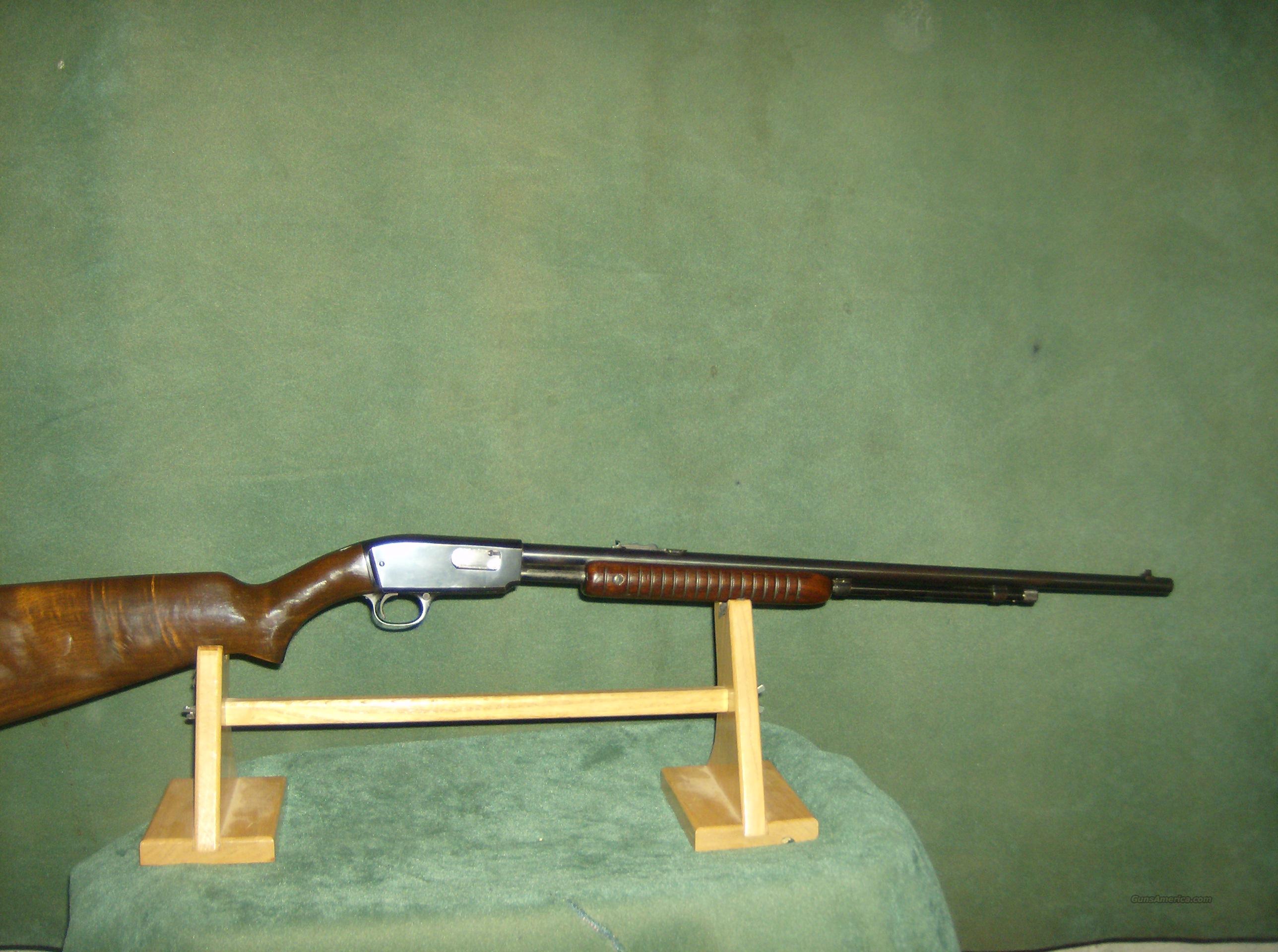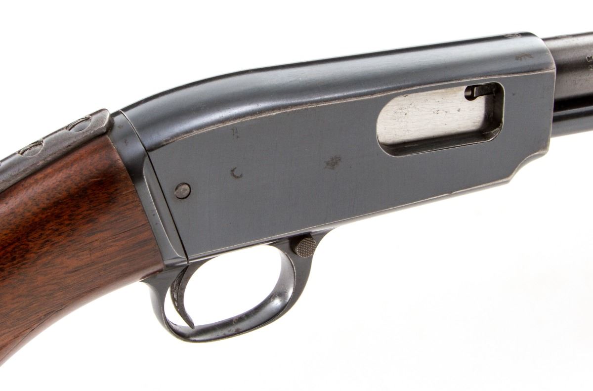 Model 61 is often considered a companion to Winchester Model 12 and Model 42 shotguns . Model 61 was fitted with plain walnut pistol-grip stock, with grooved slide handle . All Model 61s were take-down variety . Pre-war models will have a short slide handle . Manufactured between 1932 and 1963 . Approximately 342,000 guns were sold . Following is a list of chamber and barrel variations found in this model :