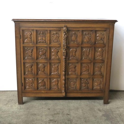 How do I date an antique buffet and hutch? I recently purchased this sideboard/hutch . It is unique . Curved glass has streaks and bobbles . The hardware is all very old . It is oak carved with great detail . Can anyone tell me what this is correctly called, and about how much this might be worth .