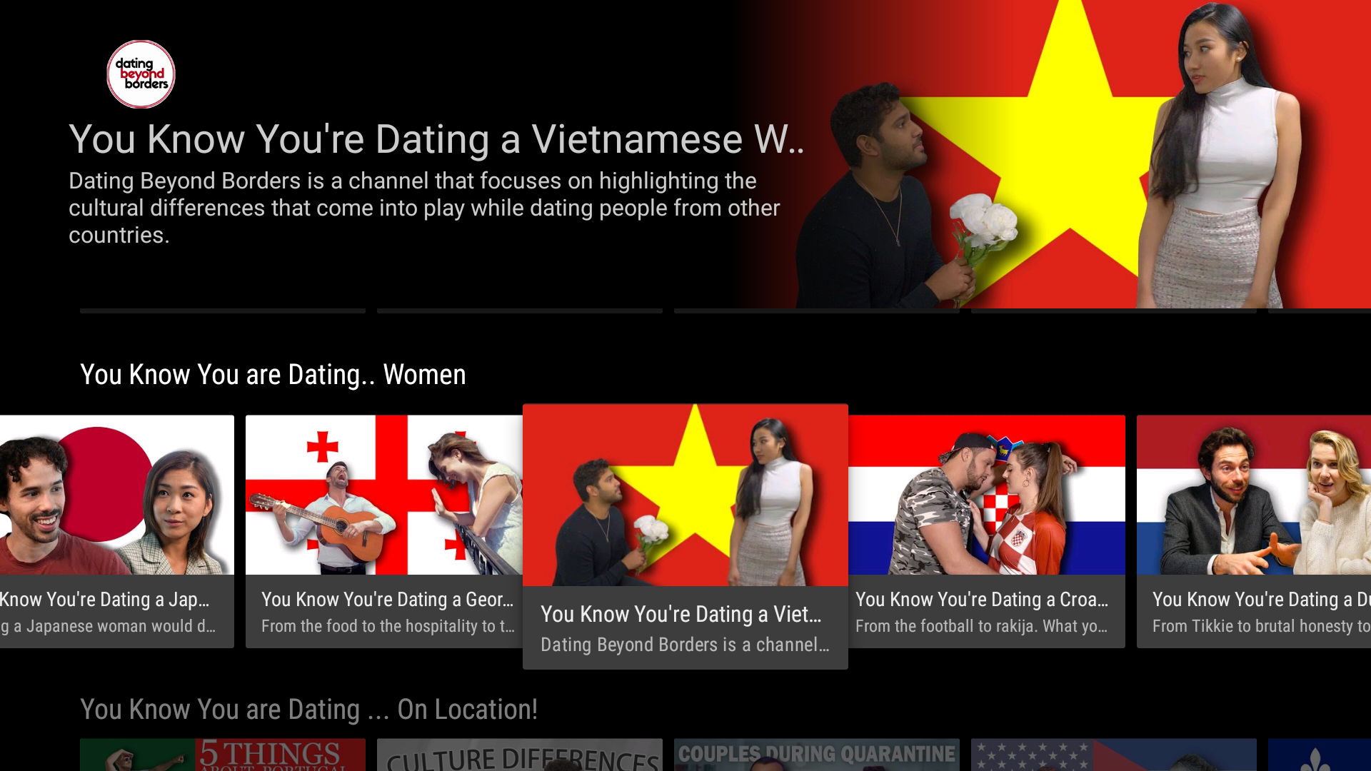 Dating Beyond Borders : With Elina Miyake Jackson, Gabriel Shaughnessy, Vanessa Da Silva Dias, Nick Smyth . A channel that focuses on dating tips and trends from around the world .