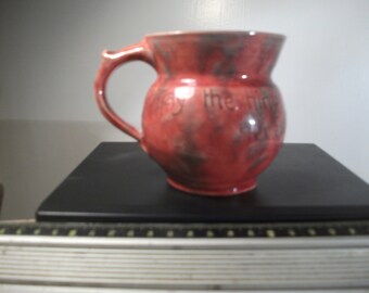 A large Brannam Pottery Mug, naively adorned in sgrafitto decoration each side with red squirrels on branches, the base with impressed marks, 'B&S' and incised 'RAS F3', 7in (18cm) high, together with a large Baron Barnstaple three-handled mottoware cup, date incised '87', signed 'SI', cracked and chipped (2)