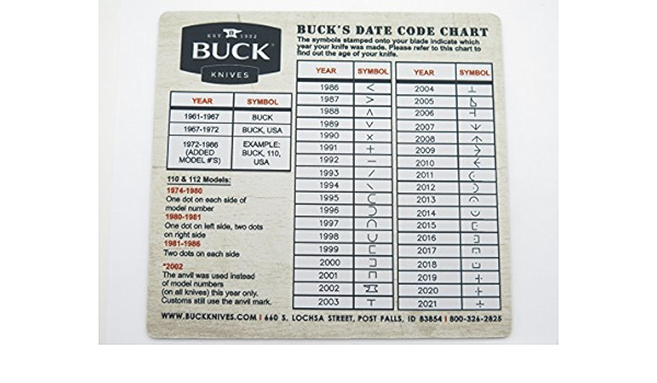 BUCK'S DATE CODE CHARTThe symbols stamped onto your blade indicate which year your knife was made . Please refer to this chart to find out the age of your knife . 110 & 112 MODELS:1974-1980One dot on each side of model number1980-1981One dot on left side, two dots on right side1981-1986Two dots on each side*2002The anvil was used instead of model numbers (on all knives ) this year only .