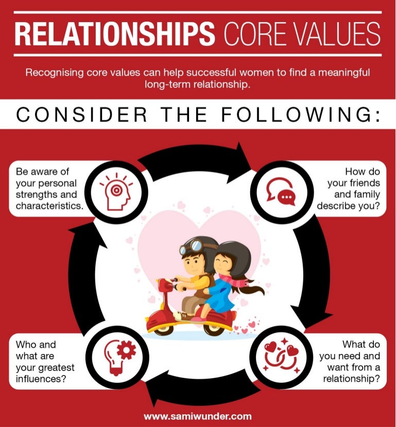 Core values are the underpinnings of how you live your life . Be sure your relationship values have substance when discussing them with your partner . Here're 10 important core values for a successful relationship: 1 . Trust . This core value stands above all others . It is the foundation of your relationship . Without trust you basically have nothing .