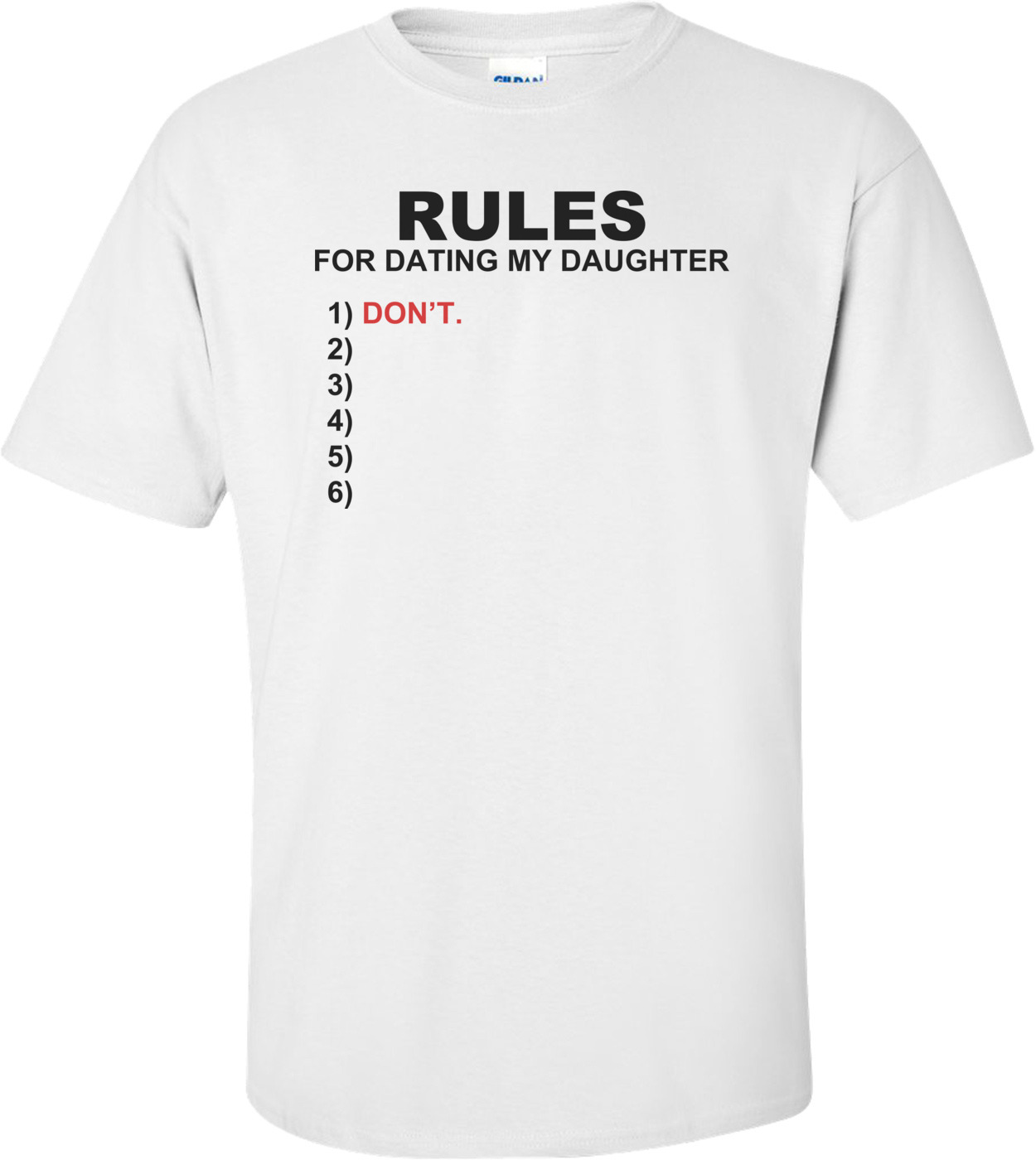 Rules for Dating My Daughter T-Shirt #44484 . Price: Buy 2 or more and save $2 .00 per item In Stock; Qty: This tee with attitude is a great gift for yourself or a friend! This style is printed on a soft, cotton with a classic crew neckline and short sleeves . Machine wash . Specify size when ordering . Imported . Click Here to see the Size Chart . . .