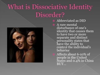 Love and DID: Sometimes More is Less . August 23, 2010 Holly Gray . Today, I'm pausing my discussion of the contributing factors in the development of Dissociative Identity Disorder to talk about Dissociative Identity Disorder and relationships . Navigating relationships may be the single biggest challenge I encounter living with DID .