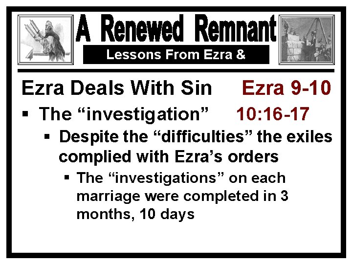 them, the names " Ezra " (Neh . 12:1, cp . Ezra 1:1-2:2) and " Nehemiah " ( Ezra 2:2) are found throughout beginning from the first year of Cyrus, at which time the men bearing these names are listed among the leaders returning from the Babylonian captivity with Zerubbabel, unto the end (or very nearly so, Neh . 12:36, etc .) .