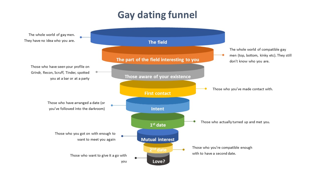 Similar to a sales funnel or sale pipe, a dating funnel is a way to visualize where various prospects are in the conversion process to your desired outcome . If your desired outcome is a date, then your funnel is the visual expression of your steps toward the desired outcome .
