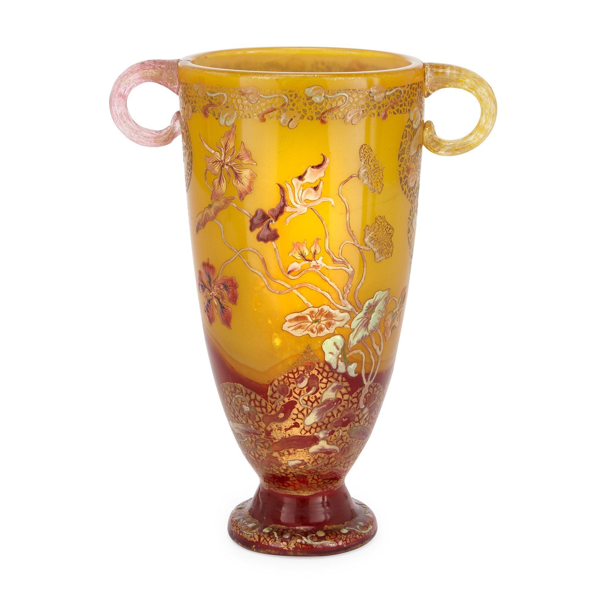 A FINE GALLE CAMEO GLASS 'SEULE FLEUR' BANJO VASE WITH FLORAL DESIGN A very attractive Galle Banjo shaped Seule Fleur vase with a charming floral design executed in two colours on a bold ground . The clear body of the vase is internally suffused with bold yellow while a double cameo glass layer in red and orange is acid etched to form the floral design .