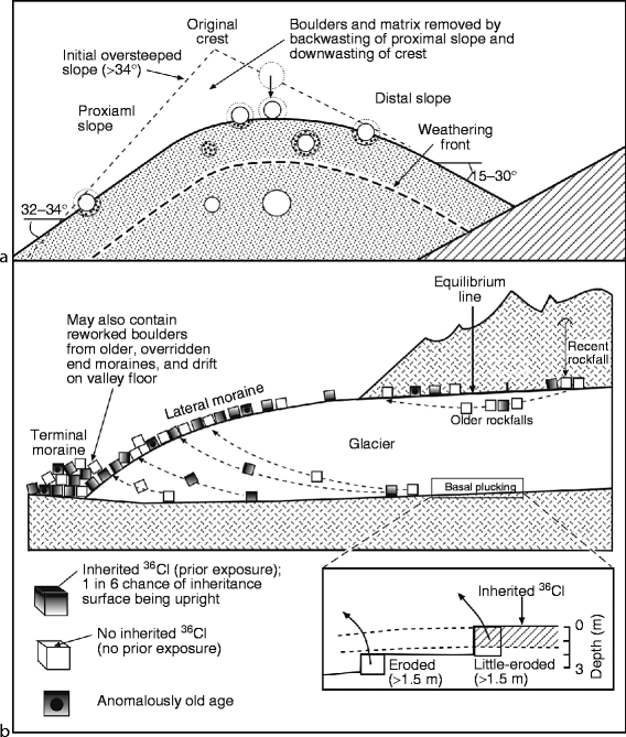 glacial sediments , and dating sediments associated with a landform can constrain landform age . However, focus on dating landforms inherently results in omitting certain landforms from this entry whose age in absolute time can only be constrained by dating glacial stratigraphy, such as subglacial depositional landforms (e .g ., eskers)