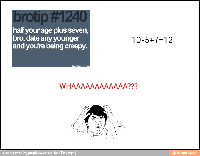 CMV: Half your age plus 7 is a bad system for dating and the threshold for social acceptableness should be higher . FTFdeltaOP By this rule of thumb, a 19 year old should be fine with dating a 16 year old, even though in my eyes that situation is socially taboo and quite predatorial .