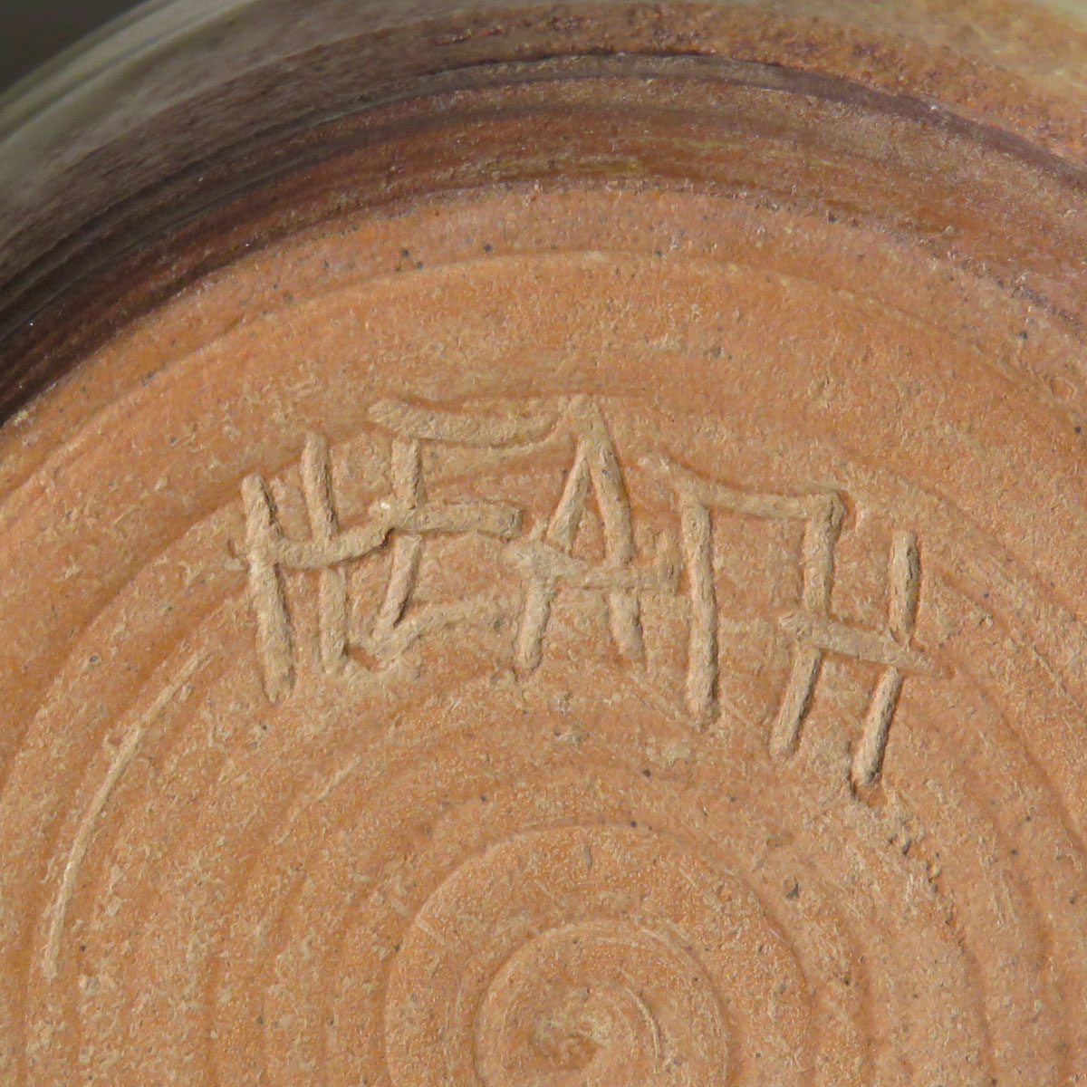 Heath Pottery . Heath used a sandy clay for much of its dinnerware lines . Dryden and Rosemeade may be sandy clay, too . This Heath bowl is clearly marked, but notice the clay color on the unglazed ring . Any pottery that has been soaked in water may be beige, too, so beware of dirty bottoms!