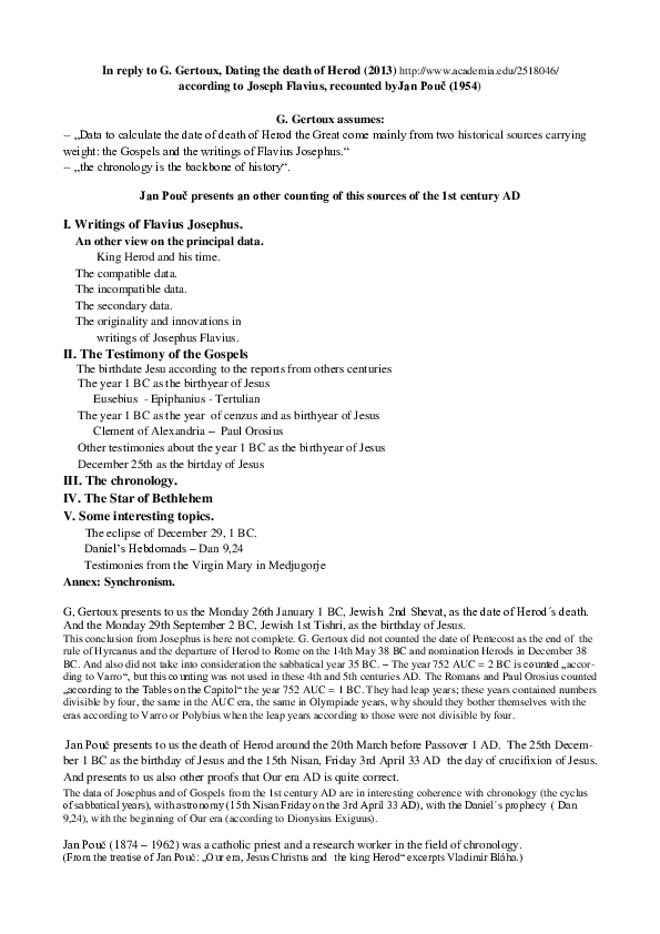 The Testimony of the Gospels dating the birth, ministry and crucifixion of Jesus G . Gertoux: " Herod died shortly after the birth of Jesus - (Luk 1,5, 30-31 . Mat 2,1-23)" Counting Jan Pouč: Our era, Jesus and Herod .