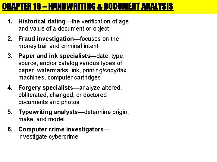 Ink analysis and dating can also be conducted on machine printed document such as inkjet ink and toner from photocopiers, laser printers, and facsimile machines . Forensic Paper Examination Optical and chemical analysis can be conducted on paper to help establish if document fraud has been committed .