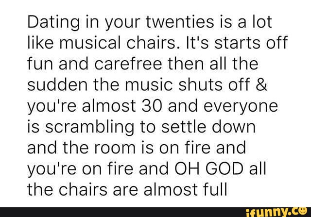 Musical chairs , do you remember this activity from childhood? The music plays as everyone walks in circles striving to be the last one standing . Once the music stops everyone is scrambling to find a chair but if you're not quick enough, you're out . I liken this activity to dating in your 30s . Why?