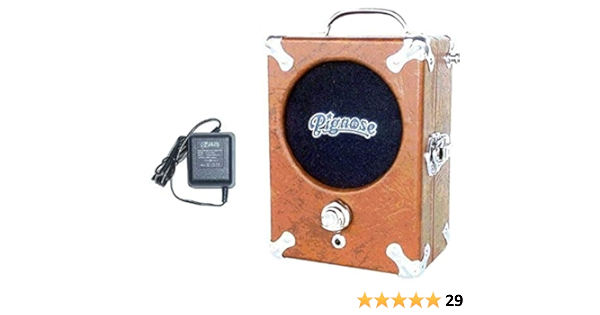 Pignose was THE first portable, battery-powered amplifier made specifically for guitar . It sounded like an over-driven Marshall 50 stack, but could be put on a guitar strap and slung over your shoulder . The amp had that same gritty, dirty distortion of refrigerator-sized amps , but only pumped out 3 to 5 watts and weighed in at around 5 pounds!
