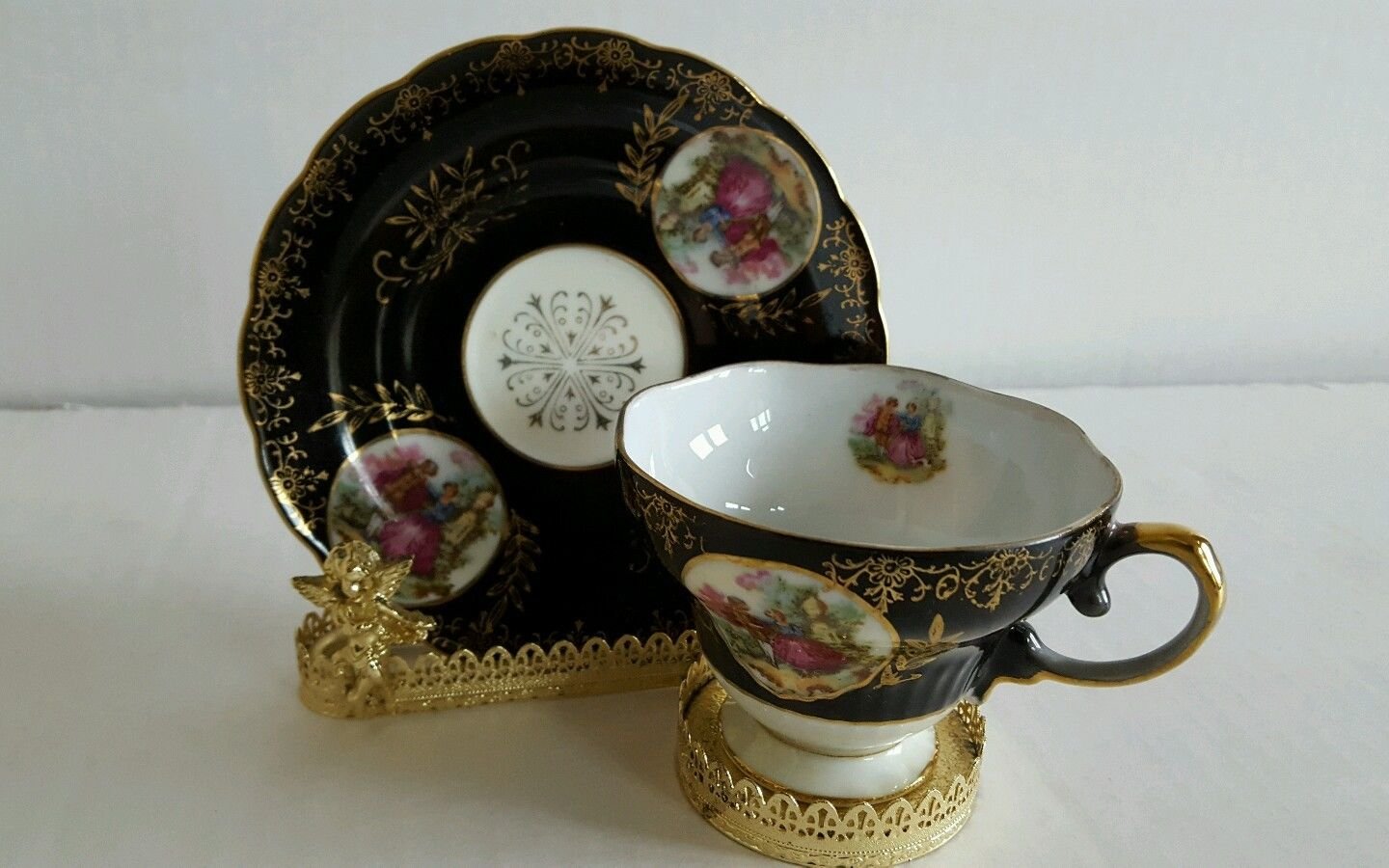 They are beautiful reddish purple with gold edges and some iridescence to the white . Each cup and plate have 4 portraits in ovals-2 each of 2 different women . The back of the saucer says " Royal Sealy China Japan" and has a white seal in an off orange crest with leaves on each side . They are in excellent condition .