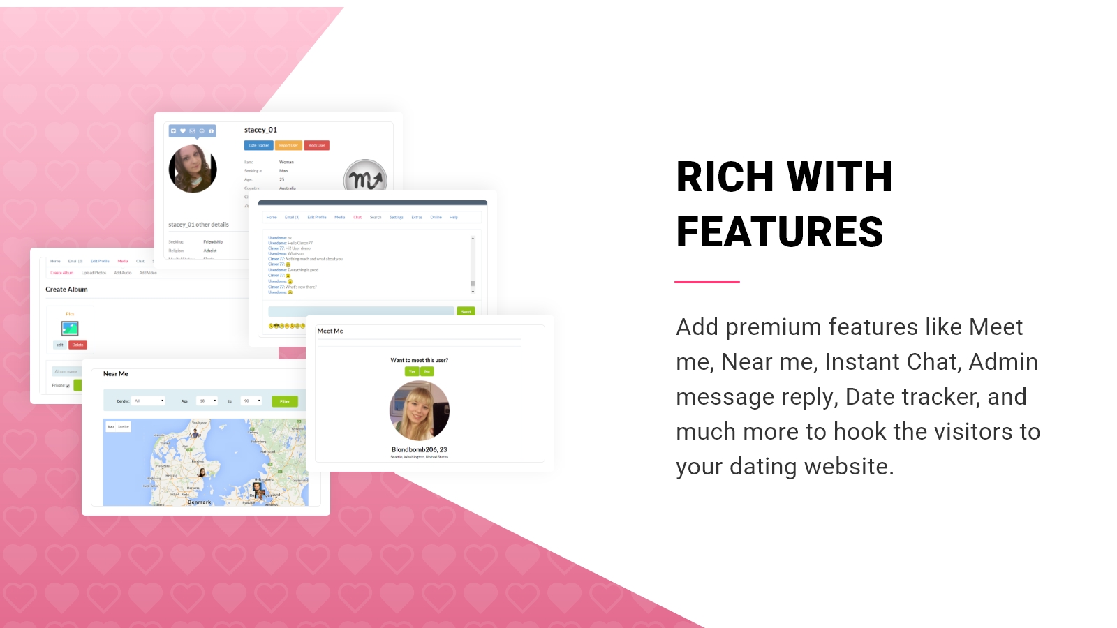 Out of the box features for your online dating business . Out of the box it includes essential features useful for instant engagement of users and website monetization . At the same time SkaDate is the easiest software to expand with a myriad of native and third-party plugins .