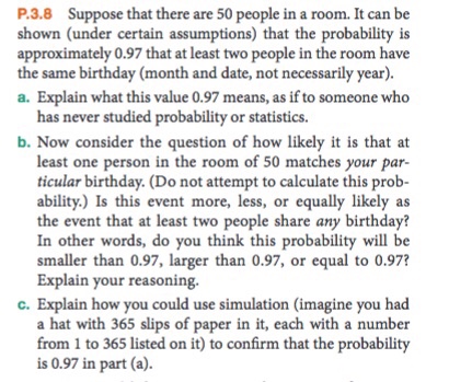 is the probability that three people will have different birthdays . Therefore, the probability that at least 2 will have the SAME birthday is 1- 0 .9917958341152186 = 0 .008204 . This is the compliment . Therefore there is a 0 .82% chance that from three people at least 2 will have the same birthday . Now to answer the question of 30 people .
