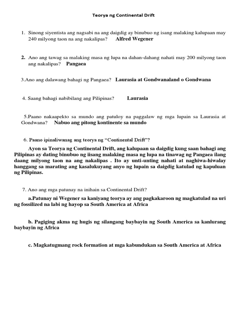 1 . Tawag sa malaking masa ng lupa na sinasabing pinagmulan ng Pilipinas . A crust B . bulkan C . tectonic D . Pangaea 2 . Teoryang tungkol sa unti-unting paggalaw ng mga kalupaan mula sa isang supercontinent . A . Teorya ng Bulkanismo C . Teorya ng Tulay na Lupa B . Teorya ng Tectonic Plate D . Teorya ng Continental Drift 3 .