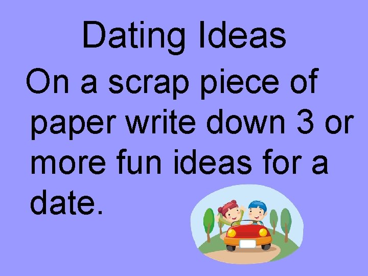 Writing About Dating . Here are some writing activities that, unless otherwise noted, are great for groups, pairs or individuals . Tell a story - Imagine two people from very different cultures are going out on a first date . What kinds of problems might they have? Write a story about them and their date . Develop an online dating profile - Work in a group .