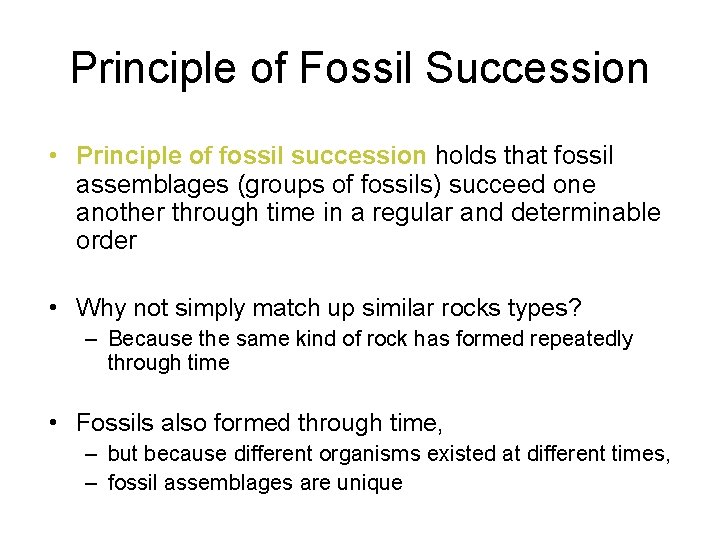 However, another form of relative dating is the use of fossil succession: the principle that certain assemblages of fossils can be tracked in a stepwise fashion through geologic time . In order to use fossils for relative dating , scientists focus their efforts on index fossils . These fossils represent plants and animals that lived for a . . .