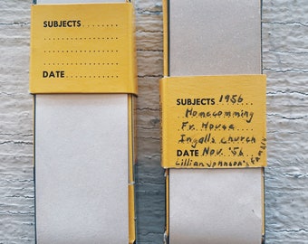 Several physical clues point to a date of the 1950s for this photo - the deckled (scalloped) edges, the Kodak Velox paper and the fact that it came bound in a small spiral-bound book from the developer (hanging chad on the side) . Slides will also have a date stamped on the paper or plastic mount .