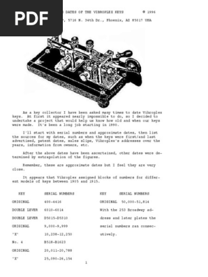 advertised, patent dates, sales slips, Vibroplex's addresses over the years, information from owners, etc . After the above dates have been ascertained, other dates were de- termined by extrapolation of the figures . Remember, these are approximate dates but I feel they are very close . It appears that Vibroplex assigned blocks of numbers for differ-