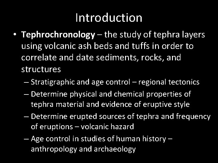 Tephrochronology is a geochronological technique that uses discrete layers of tephraโvolcanic ash from a single eruptionโto create a chronological framework in which paleoenvironmental or archaeological records can be placed . Such an established event provides a "tephra horizon" . The premise of the technique is that each volcanic event produces ash with a unique chemical "fingerprint" that . . .
