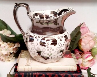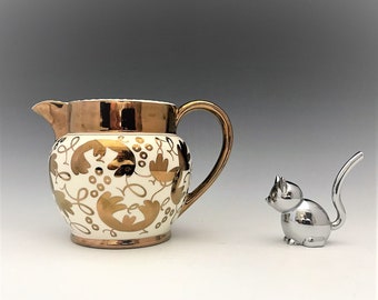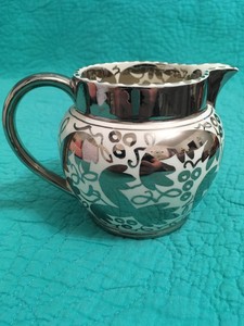 Wedgwood lustreware made in the 1820s spawned the production of mass quantities of copper and silver lustreware in England and Wales . Cream pitchers with appliquΓ©-detailed spouts and meticulously applied handles were most common, and often featured stylized decorative bands in dark blue, cream yellow, pink, and, most rare, dark green and purple .