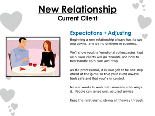 Actively listen to your client and be intuitive . Be patient with them, and cater and adapt to their needs . Offer up your own advice and recommendations . Immediate response is a major factor in establishing good relations with your client ; in fact 47% of buyers rated responsiveness as key, even over professionalism, local expertise, and experience .