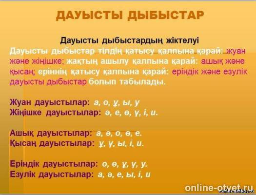 Дауысты дыбыстар: жуан, жіңішке; ашық, қысаң; еріндік, езулік дауыстылар, емлесі, ҰБТ, Қорытынды аттестаттау және 4, 9 және 11-сыныптарға арналған ОЖСБ сынақтарына дайындықтың онлайн жаттықтырғыш құралы . iTest - қазақ және орыс тілдеріндегі 20 пән . . .