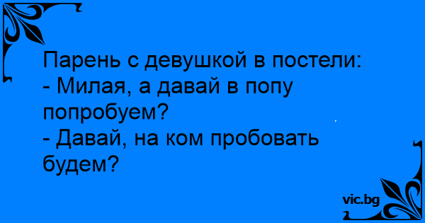 Давай в попу . Нет . Почему? В попу больно! Ты пробовала? Нет . . . Как можно делать вывод о том чего не пробовала? . . Вот таким простым методом (как в шахматах е2 е4), меня без проблем получилось развести .